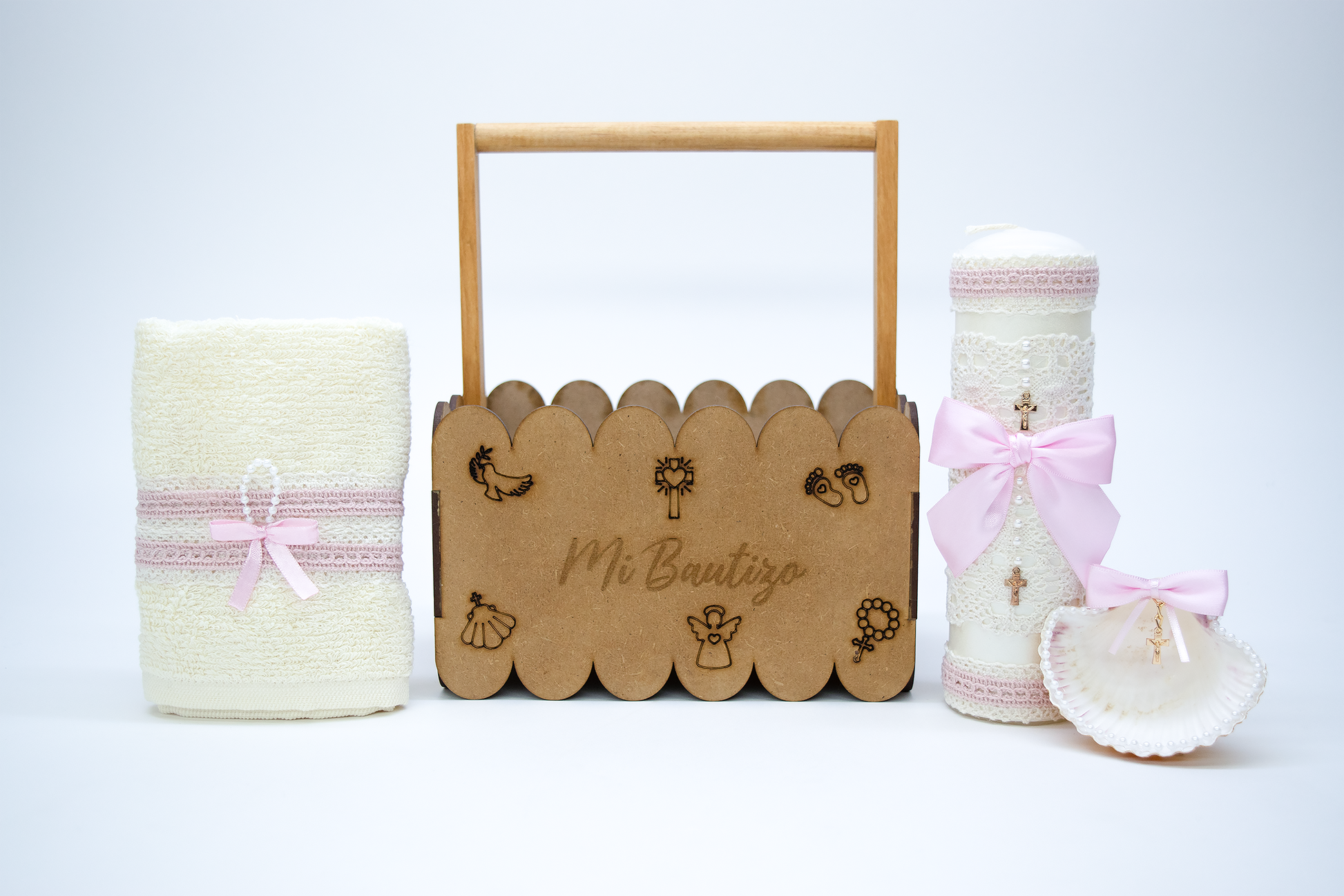 Kit Vela Canasta Madera Bautizo Niña Color Hueso - Rosa